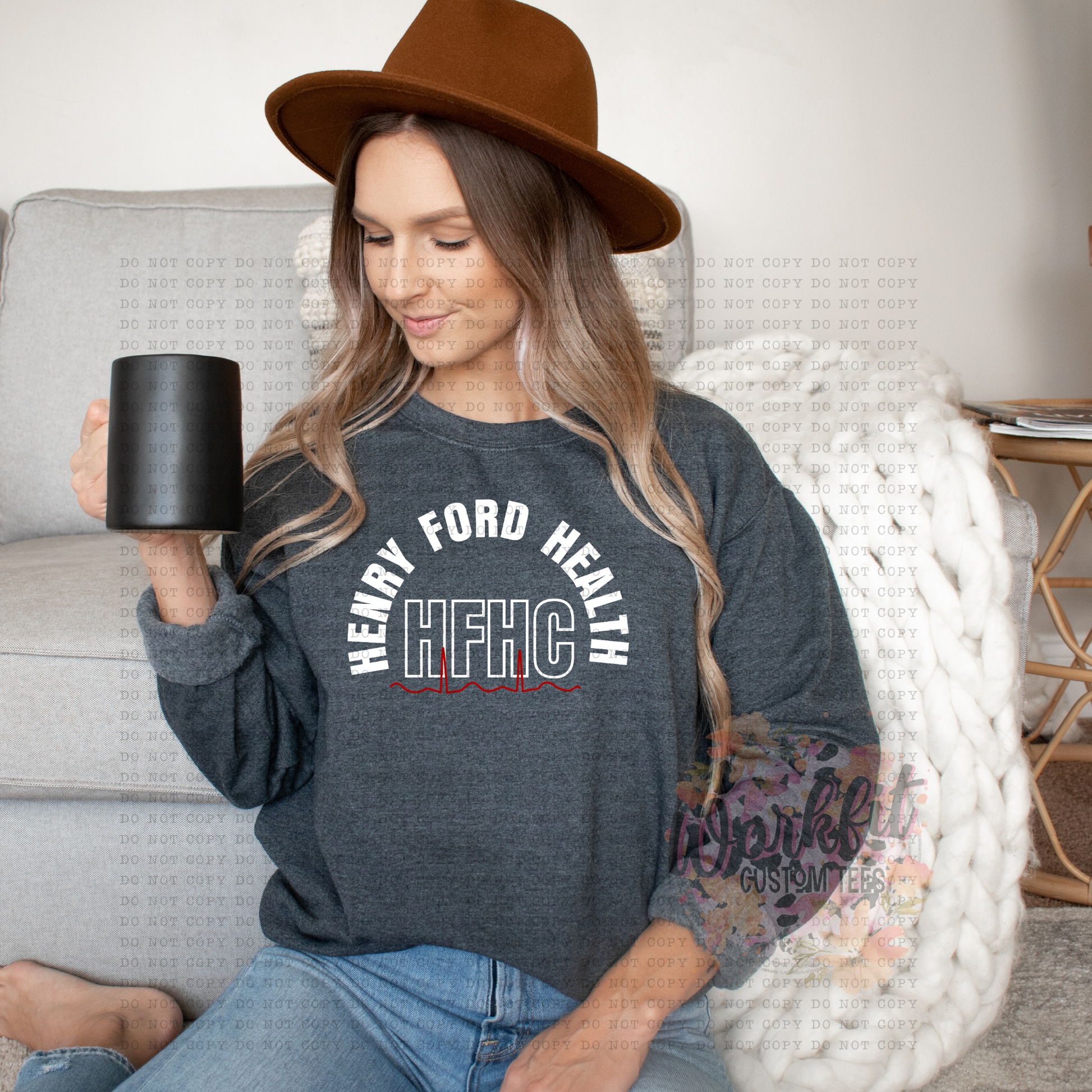 In house Design by Workfit Scrubs- HFHC crewneck offered on a unisex Gildan sweater 50% cotton 50% polyester.